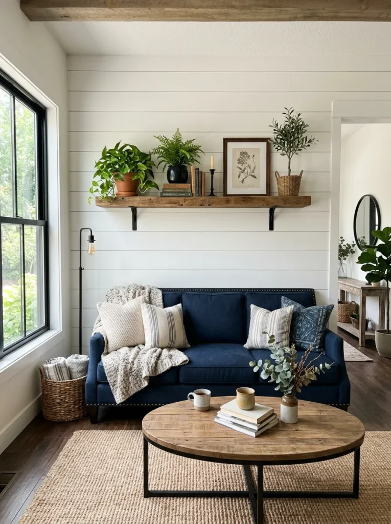 Shiplap became a cultural phenomenon the moment Chip and Joanna Gaines introduced it to the masses — and unlike most trends, it aged extraordinarily well. Horizontal shiplap paneling brings texture, depth, and unmistakable farmhouse character to any living room wall, whether it’s painted crisp white, left natural, or stained in a warm honey tone.