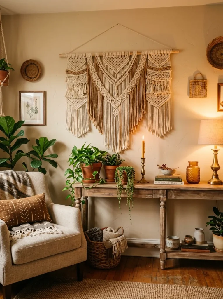 • Go large — a statement macramé piece spanning two to three feet wide commands the wall rather than quietly sitting on it