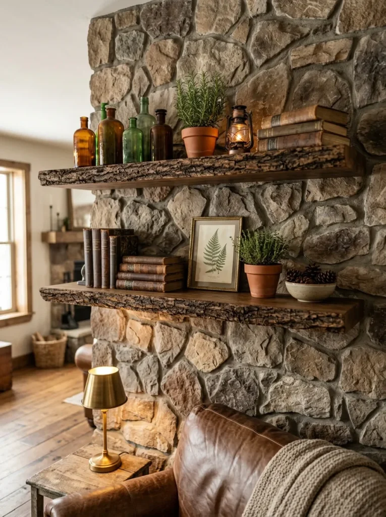 Floating shelves in a rustic living room aren’t just storage — they’re curated vignettes that tell the story of a life well-lived. The key differentiator between rustic shelf styling and generic shelf styling is the objects: think vintage glass bottles, old hardcover books, antique clocks, ceramic crocks, and the occasional piece of found nature (a dried wheat bundle, a smooth river stone, a sprig of eucalyptus).
