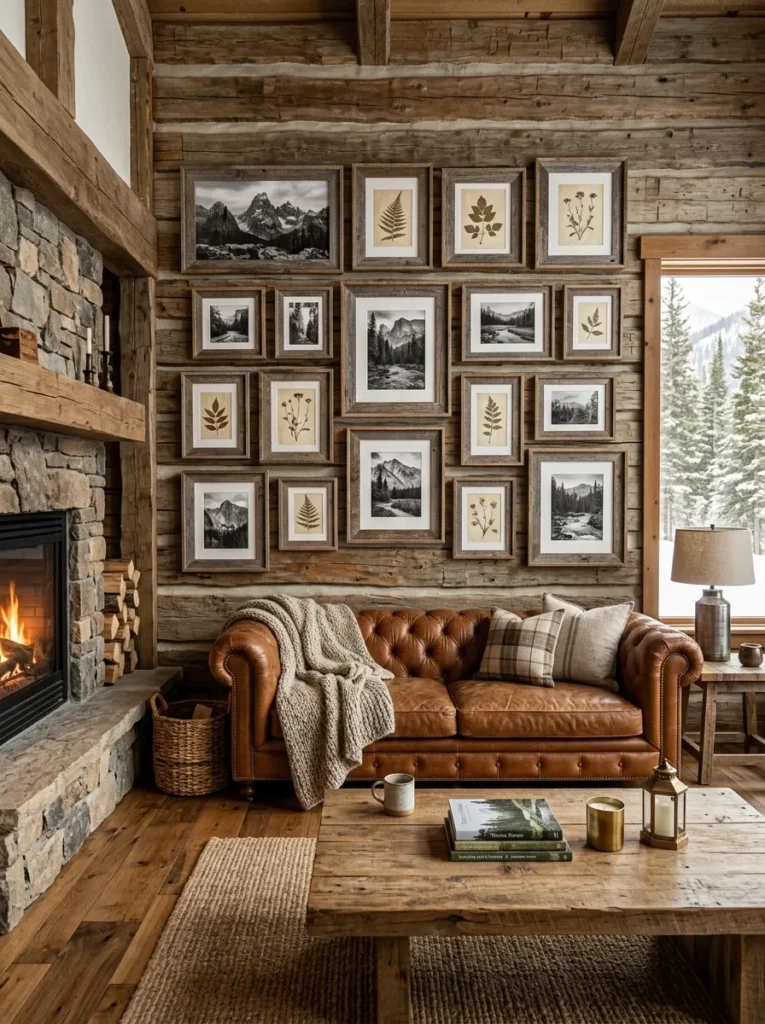 Mix frame sizes wildly. Constrain the color palette of the art itself to keep things cohesive. A rustic gallery wall should look curated by a well-traveled person, not assembled from a single box set.