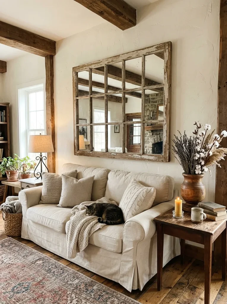 Old architectural salvage pieces — window frames, door panels, shutters, corbels — are the secret weapon of rustic interior designers who want history on the wall without the museum price tag. A vintage window frame with original glass panes (or mirrors inserted where the glass used to be) becomes instant statement art with a depth of character that took decades to develop.