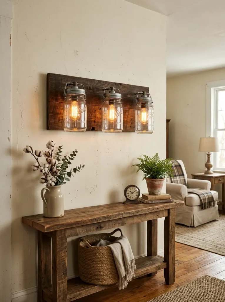 Mounted on reclaimed wood backing boards with vintage Edison bulbs inside, mason jar sconces cast the warmest, most amber-toned light imaginable — the kind that makes every person who sits beneath them look like they’re lit by a cinematographer. Flank a mirror, anchor a gallery arrangement, or line them along a narrow hallway wall: