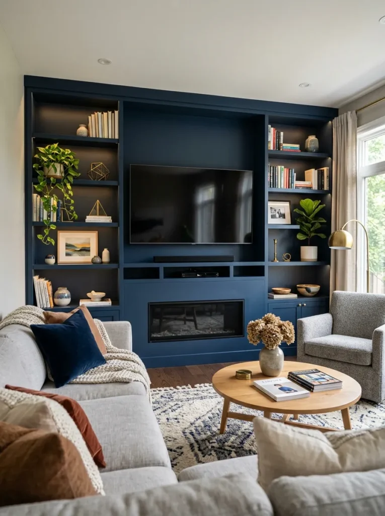 Built-in shelving flanking and surrounding the TV is the gold standard of television wall design — and for good reason. It transforms the screen from an awkward focal point into the intentional centerpiece of a fully realized wall composition. The television stops being “the TV wall” and becomes simply… the wall. A beautiful, purposeful one.