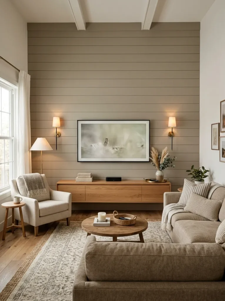 When the wall itself is beautiful, the television mounted on it becomes a feature rather than a flaw. Full-wall wood paneling — whether that’s shiplap, vertical slat panels, or engineered wood veneer — creates a rich textural backdrop that visually absorbs the TV rather than surrendering to it.