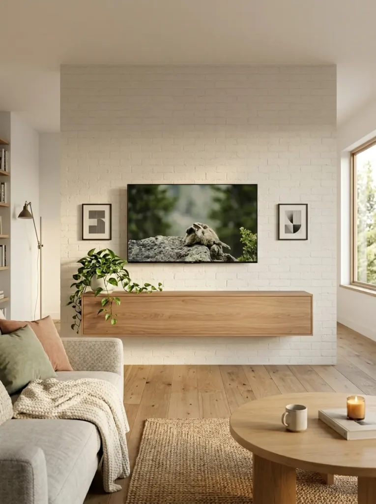 Sometimes the most powerful decor move isn’t what goes beside the TV — it’s what goes below it. A beautifully styled floating media console anchors the television visually, bridges the gap between screen and floor, and creates a natural surface for curated decor that draws the eye downward and creates a complete, top-to-bottom wall composition.