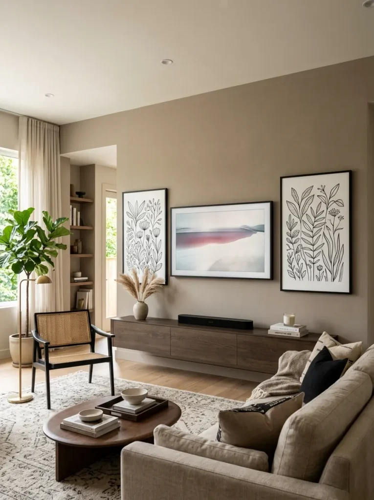 Symmetry is one of the most reliable tools in interior design, and nowhere does it work harder than on the TV wall. Flanking the screen with two matching large-format art panels or framed prints creates instant visual balance — the eye moves left, to the screen, and right in a smooth, satisfying sweep rather than landing on the TV and stopping dead.