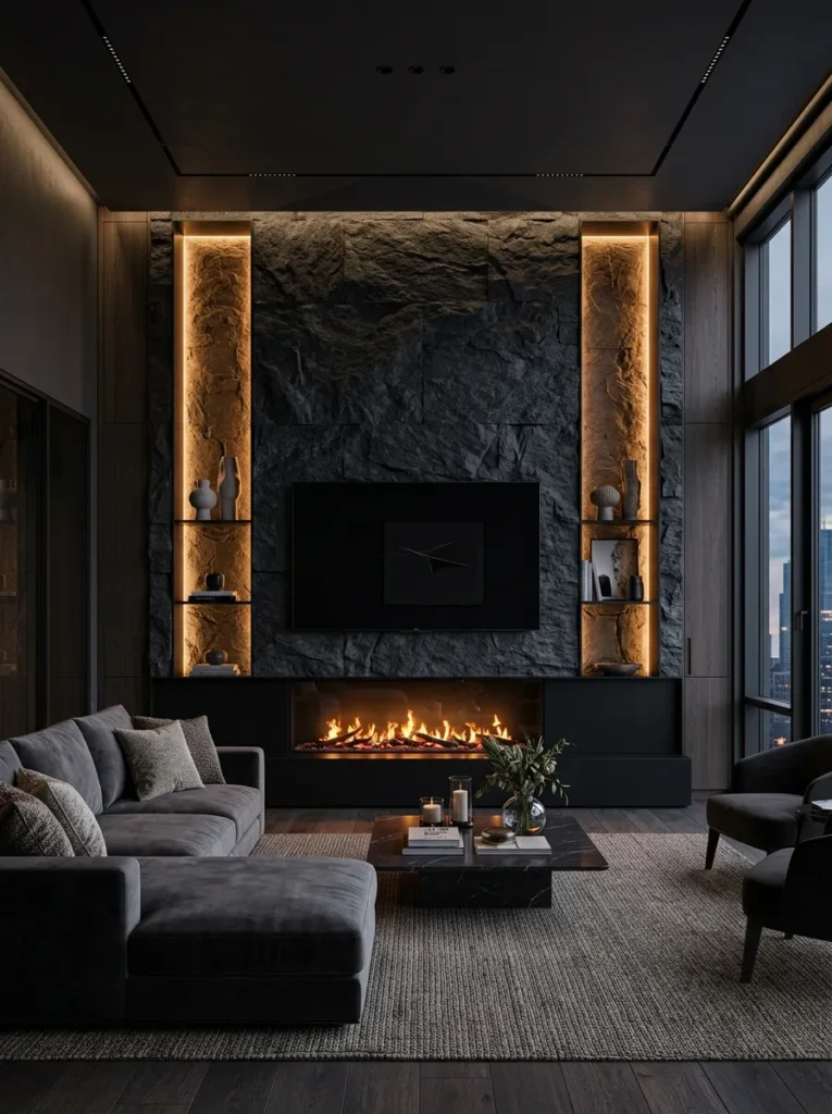 The double feature: TV above, fireplace below. Few wall configurations communicate “this room was designed” more powerfully than a television integrated into a feature wall that also houses a fireplace — electric or gas. The two focal points share a wall and, rather than competing, they reinforce each other’s impact through sheer combined presence.