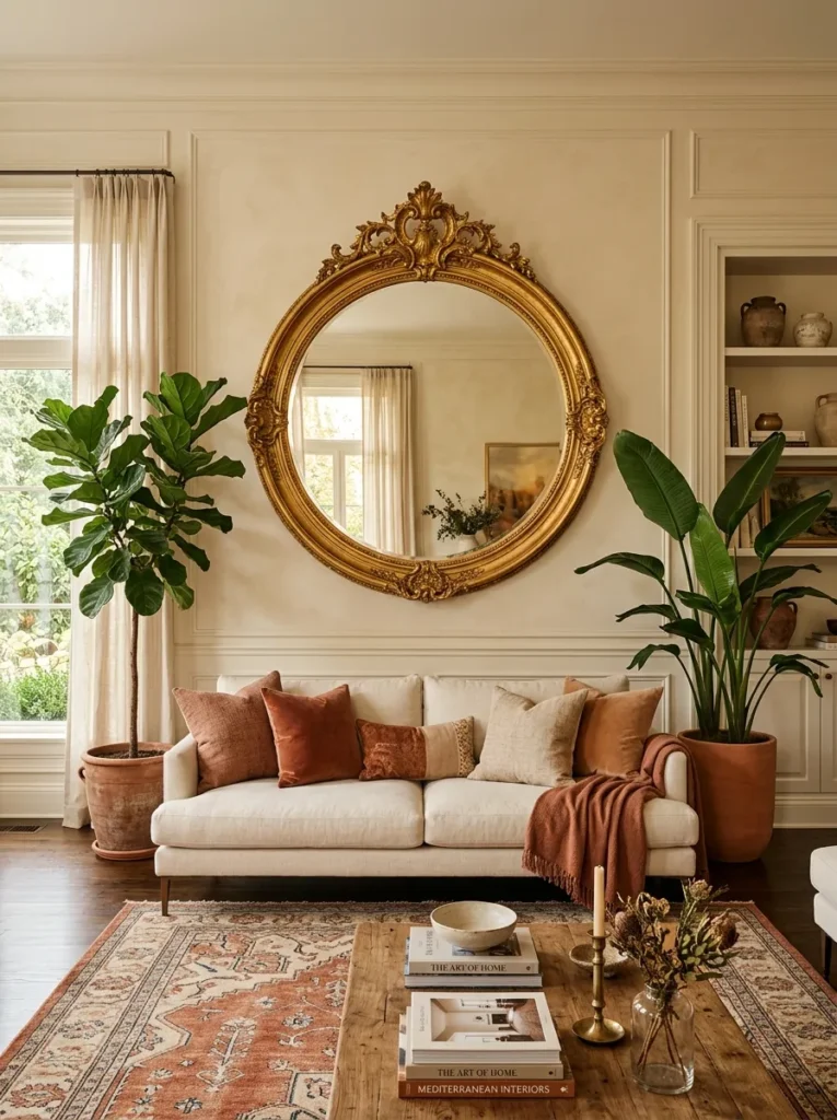 The sweet spot for a large living room? A mirror that’s at least 48 inches in diameter or a full-length leaner that hits near ceiling height. Go bold or go home — literally.