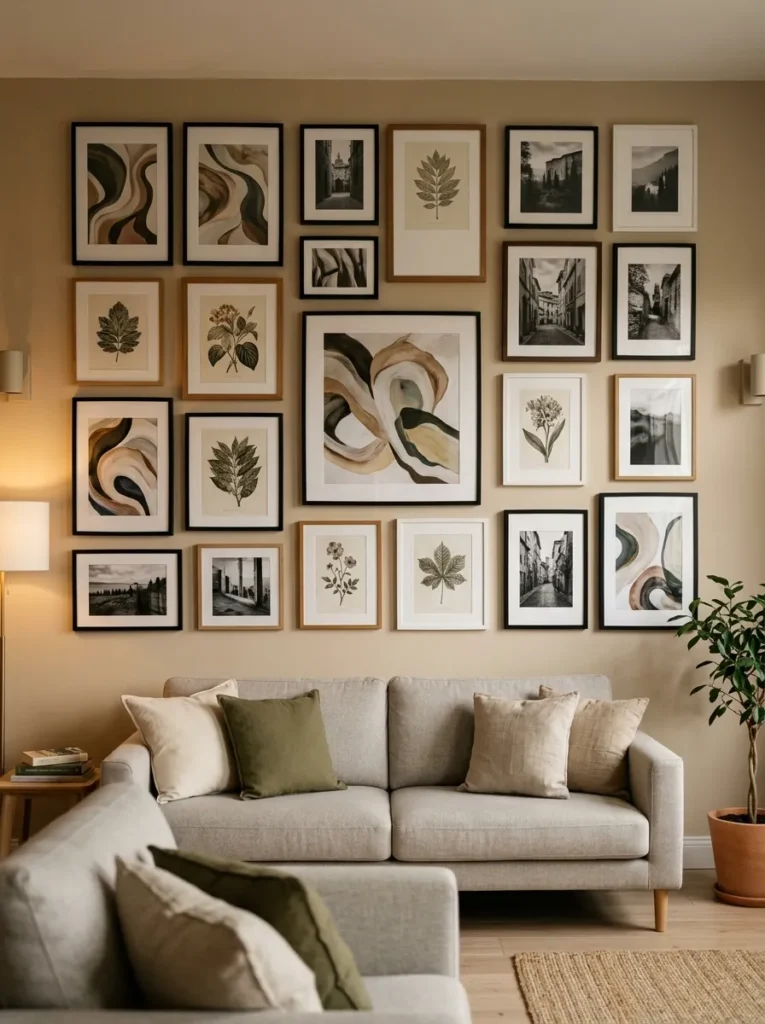 - Anchor the arrangement with one oversized centerpiece print, then build outward