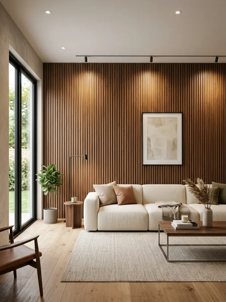 Flat walls are fine. Textured walls are extraordinary. Fluted wood panels, shiplap, limewash plaster, 3D geometric wall tiles — the moment you add dimension to a large living room wall, the entire room shifts from “nice house” to “magazine feature.” Textured panels are particularly powerful because they don’t require any additional decor. The wall is the decor.