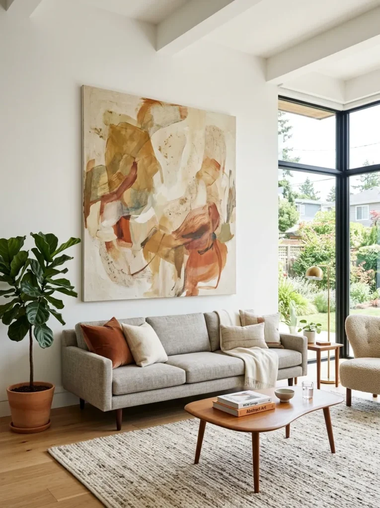 Sometimes the most powerful design move is the most restrained one. Instead of filling a large wall with multiple pieces, commit to one extraordinary artwork. A single oversized canvas — we’re talking 60 inches wide or more — commands attention in a way that a dozen smaller pieces simply cannot. It’s the visual equivalent of a confident pause in conversation. Everything stops. Everyone looks.