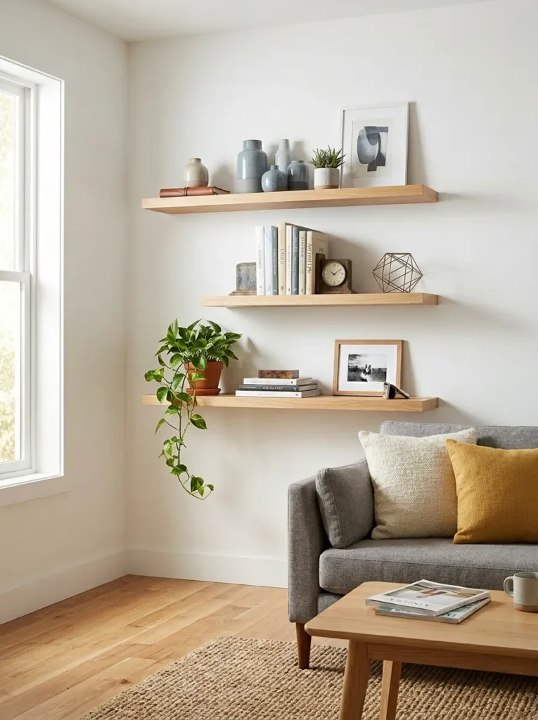 - Use odd-numbered groupings: three or five shelves feel more dynamic than two or four