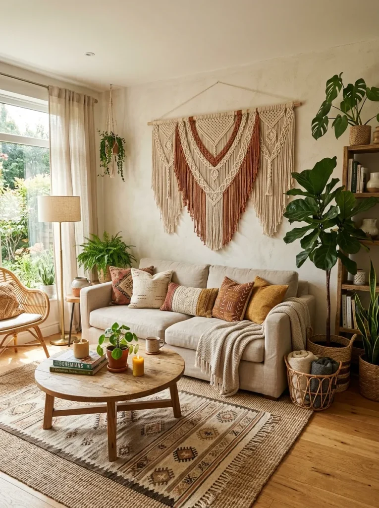 Not everything on a wall has to be framed, flat, or permanent. Textile wall art — think woven tapestries, macramé hangings, or hand-loomed fiber pieces — brings warmth, texture, and an organic quality that no canvas or print can replicate. On a large wall, an oversized tapestry functions like a painting but with an added softness that absorbs sound and makes a room feel genuinely cozy.