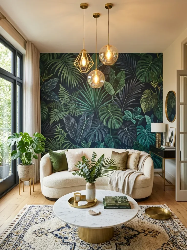 Here’s a large wall solution that quite literally transforms a room overnight: a mural or statement wallpaper. Not your grandmother’s floral wallpaper — the current generation of wallpaper designs includes breathtaking botanical prints, abstract ink wash murals, architectural trompe-l’oeil effects, and hand-painted-looking patterns that make a wall look like a work of commissioned art.